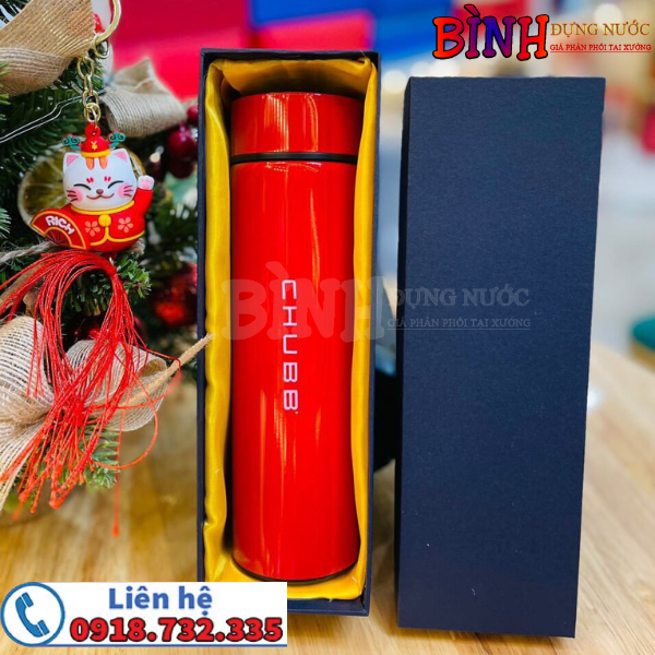 Bình giữ nhiệt đỏ và hộp xi lót lụa
